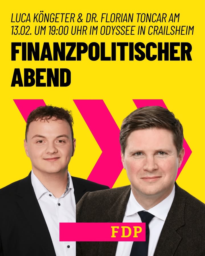 Herzliche Einladung zu unserem Finanzpolitischen Abend gemeinsam mit dem ehemaligen Parl. Staatssekretär @floriantoncar aus dem Bundesfinanzministerium, unter Christian Lindner, sowie unserem Kreisvorsitzenden und Landtagskandidaten @lucakoengeter. Stattfinden wird die Veranstaltung am Freitag, den 13. Februar um 19:00 Uhr im @odyssee_cr.