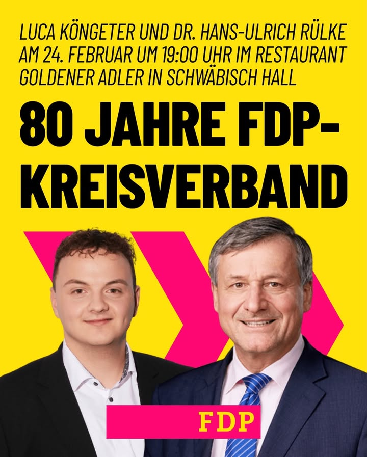🎉 80 Jahre FDP-Kreisverband Schwäbisch Hall – Wir feiern Jubiläum! 🎉 Der FDP-Kreisverband Schwäbisch Hall wird *80 Jahre alt* – und das möchten wir gemeinsam feiern! 📅 Dienstag, 24. Februar 2026 🕖 19:00 Uhr 📍 Goldener Adler, Am Markt 11, 74523 Schwäbisch Hall Als besonderen Gast begrüßen wir den Landes- und Fraktionsvorsitzenden sowie Spitzenkandidaten *Dr. Hans-Ulrich Rülke MdL*. Ebenso freuen wir uns auf die ehemaligen Kreisvorsitzenden *Dr. Walter Döring* und *Stephen Brauer*. Ein weiteres Highlight: Unser langjähriger Landtagsabgeordneter *Dr. Friedrich Bullinger* feiert in diesem Jahr *50 Jahre Mitgliedschaft* – auch dieses besondere Jubiläum würdigen wir an diesem Abend. Neben den Festreden wird es auch einen Ausblick auf die kommende Landtagswahl geben. 👉 Eingeladen sind ausdrücklich auch Nicht-Mitglieder und politisch Interessierte. Wir freuen uns auf einen festlichen Abend, spannende politische Impulse und den persönlichen Austausch! Viele Grüße Luca Köngeter