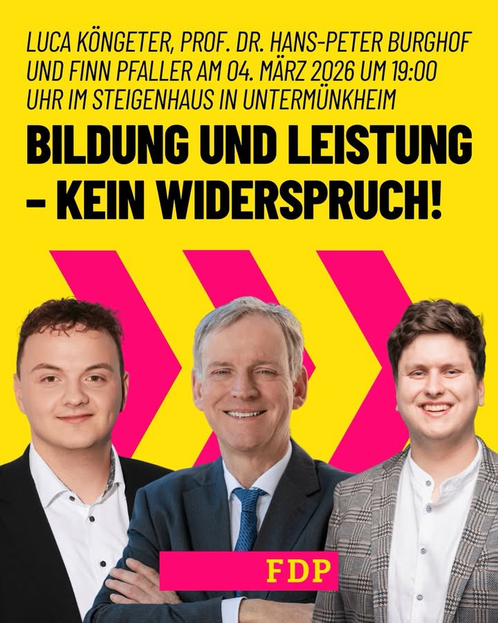 Bildung und Leistung - das ist für uns kein Widerspruch! Unsere beiden Landtagskandidaten @lucakoengeter und @finn_pfaller diskutieren gemeinsam mit Prof. Dr. Hans-Peter Burghof am kommenden Mittwoch im @landhotel_steigenhaus in #untermünkheim. Herzliche Einladung an alle Interessierte!